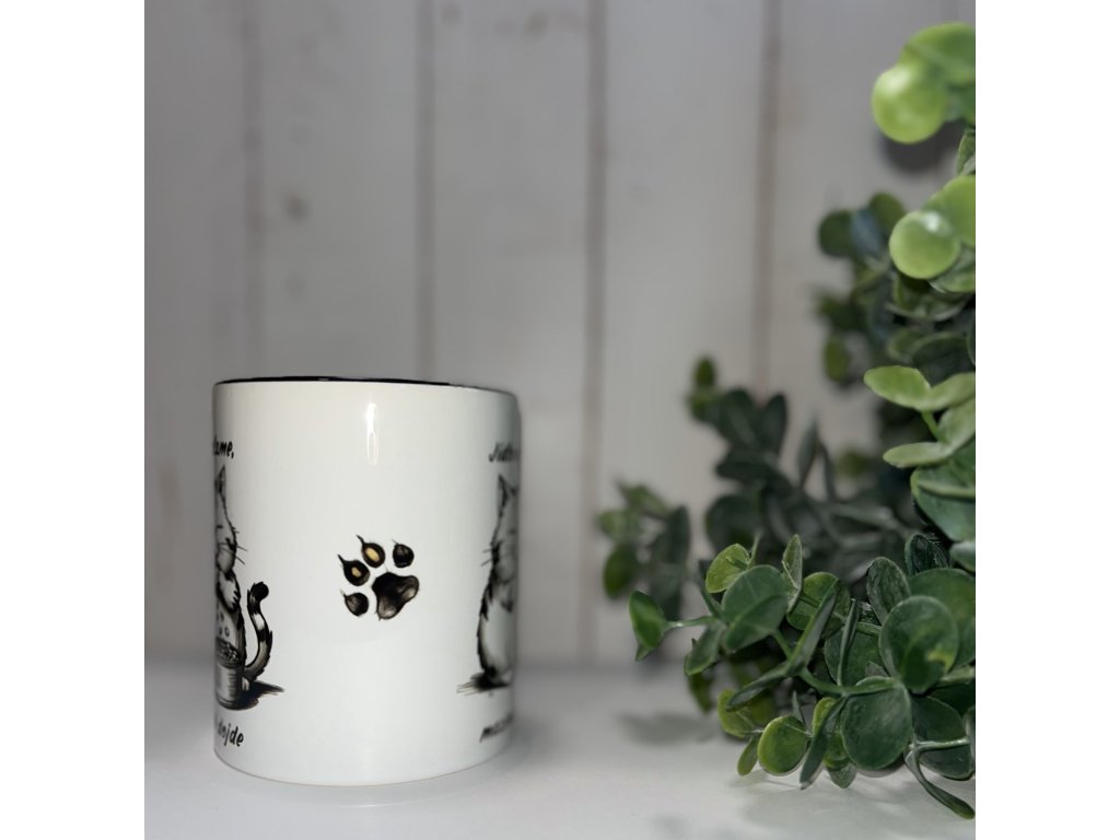 Bílý keramický hrnek s černým vnitřkem a uchem s originálním kočičím motivem ti zpříjemní každou chvilku s tvým oblíbeným nápojem. Hrnek je vhodný do myčky i do mikrovlnné trouby.