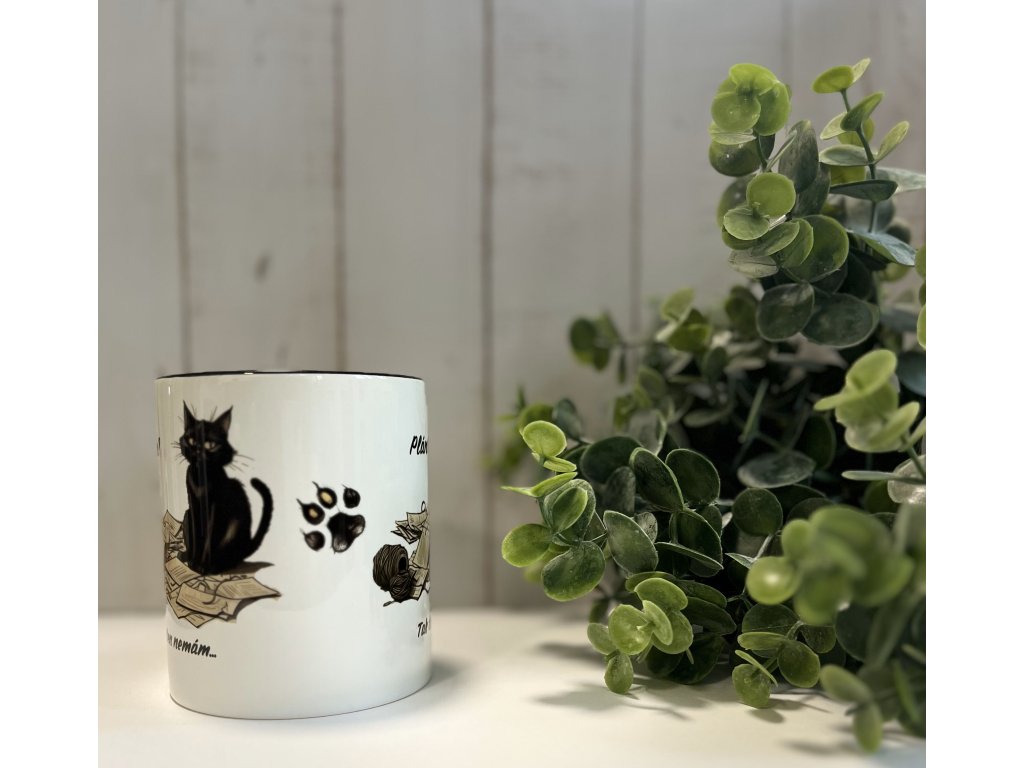 Bílý keramický hrnek s černým vnitřkem a uchem s originálním kočičím motivem ti zpříjemní každou chvilku s tvým oblíbeným nápojem. Hrnek je vhodný do myčky i do mikrovlnné trouby.